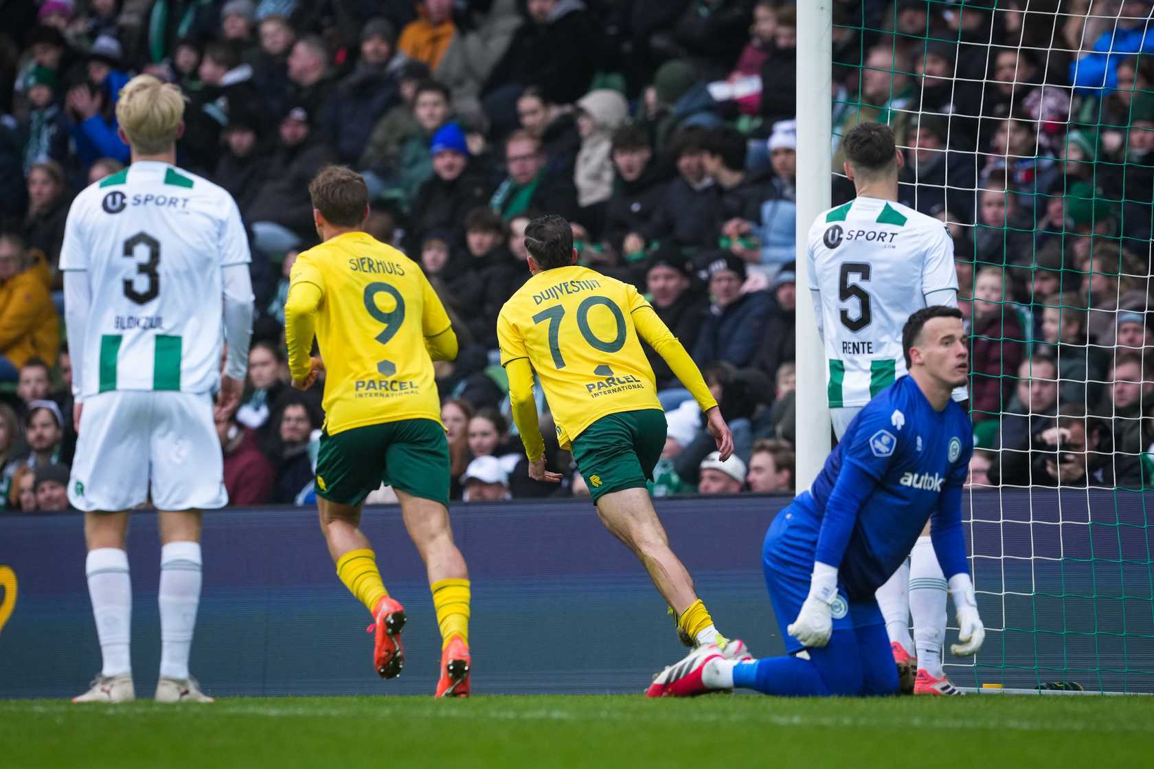 Als deze was binnengevlogen... Een Groninger gaat onder een lange bal door, waardoor deze voor de voeten van Sierhuis valt. Die probeert het in een keer vanaf een meter of 35, Vaessen pakt. Dat was anders een volgend werelddoelpunt geweest van de spits.