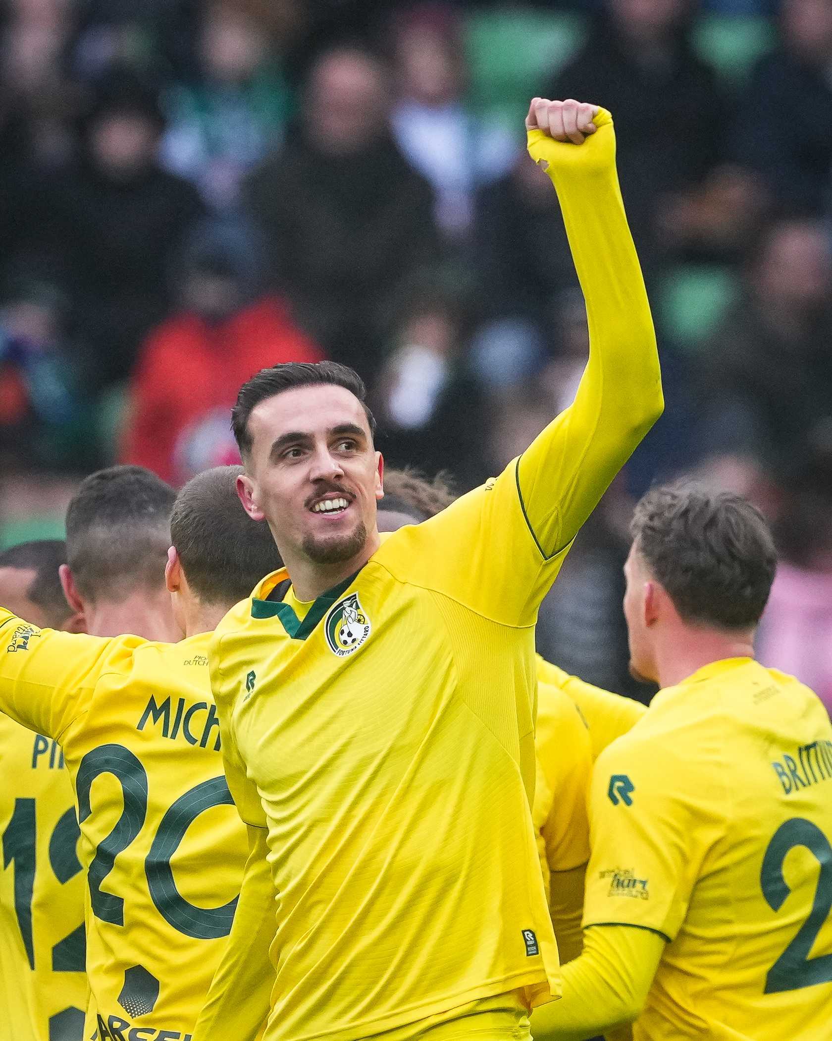 De voorsprong. Fortuna denkt met veel mensen aan aanvallen. Via Pinto komt de bal op het hoofd van Duijvestijn, die daarmee zijn eerste in het geel-groen scoort!